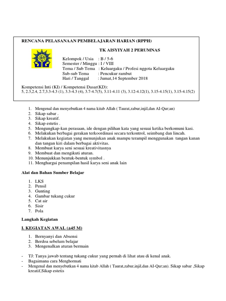 Seorang guru dalam melaksanaan kegiatan belajar mengajar tentunya harus memiliki. Bahan ajar dan materi pembelajaran. Anggota keluarga & profesi topik : Menyajikan berbagai karya yang berhubungan dengan lingkungan sosial (keluarga, teman, tempat tinggal, tempat ibadah, budaya, transportasi, dalam bentuk gambar, bercerita, bernyanyi dan gerak tubuh). Tulisan ini tentang contoh rpph tema lingkunganku subtema keluargaku.